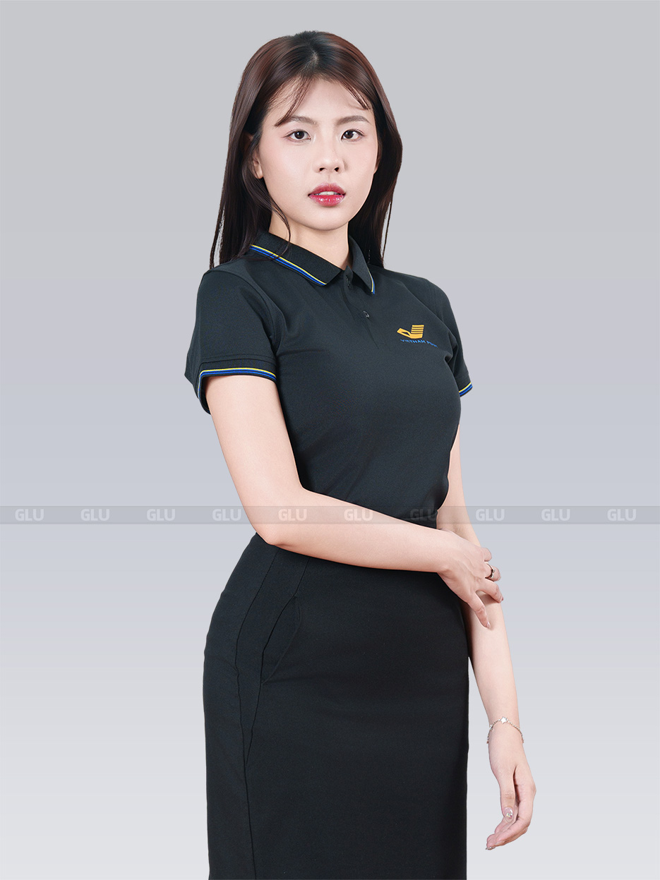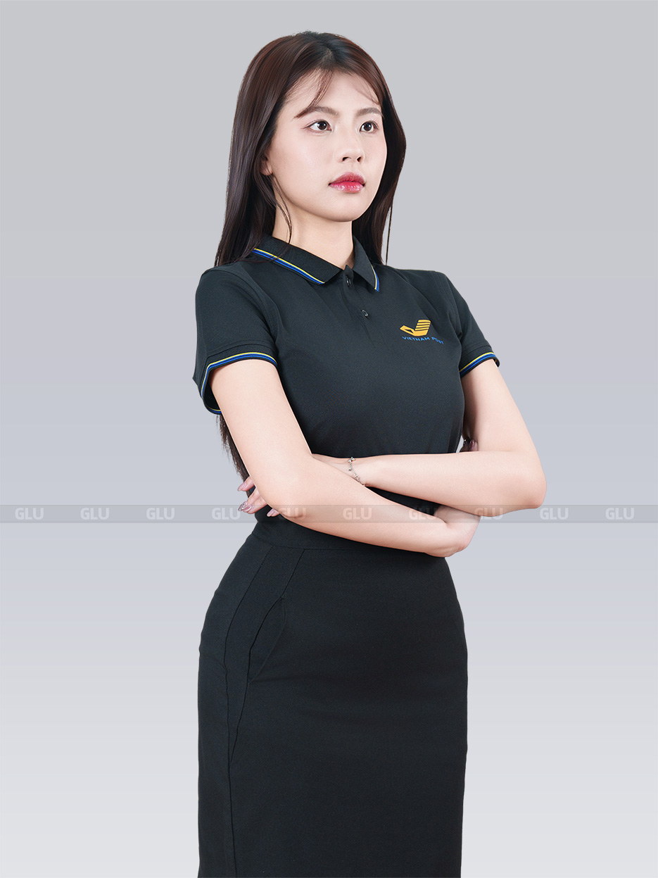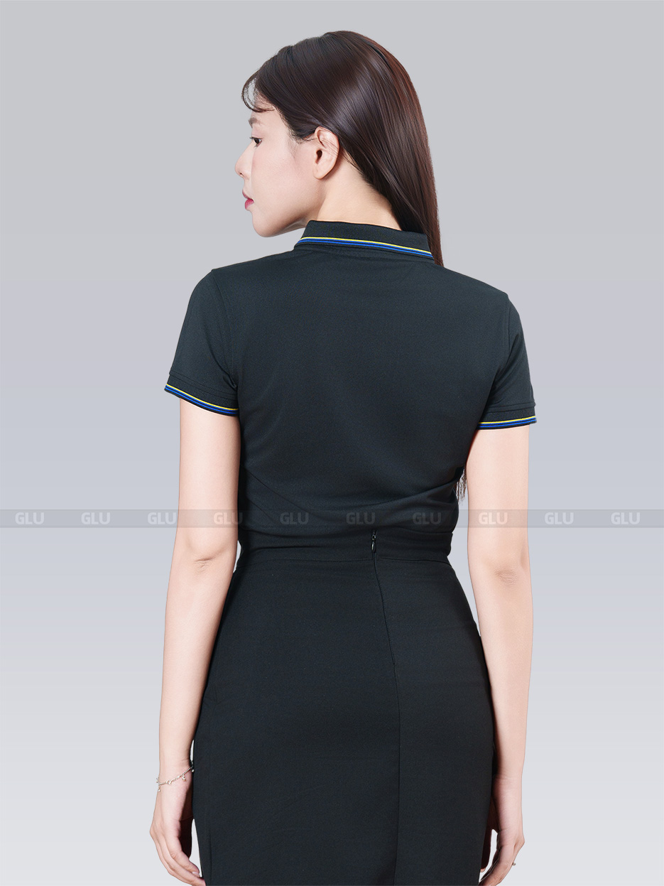 Chiếc áo đồng phục mang sắc đen tinh tế, được điểm xuyết bởi những đường kẻ xanh dương và vàng rực rỡ trên cổ áo cùng tay áo, tạo nên vẻ đẹp đầy sức sống, sang trọng mà không kém phần năng động. Thiết kế polo ôm nhẹ vừa vặn, tôn lên vóc dáng thanh lịch của người mặc, đồng thời giữ được sự thoải mái và dễ chịu trong mọi hoạt động.
