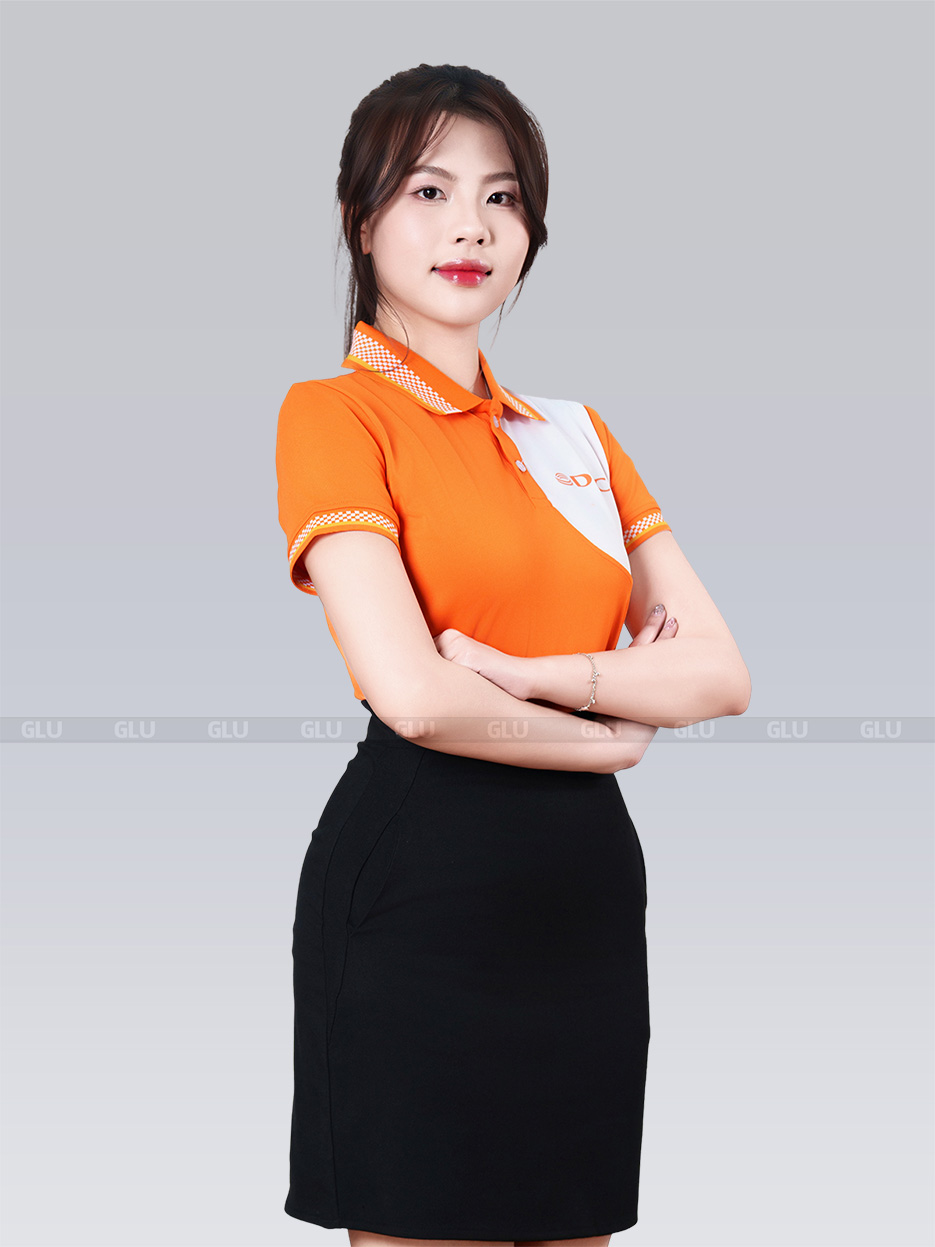 Mẫu đồng phục nữ này mang đến vẻ đẹp năng động, trẻ trung và đầy sức sống, rất phù hợp cho các doanh nghiệp tại Hải Dương. Áo polo màu cam nổi bật, kết hợp với phần trắng tinh tế ở ngực trái tạo nên sự cân bằng giữa sự tươi mới và sự thanh lịch. Cổ áo và tay áo được viền chi tiết màu cam và trắng, tạo điểm nhấn đầy cá tính.
