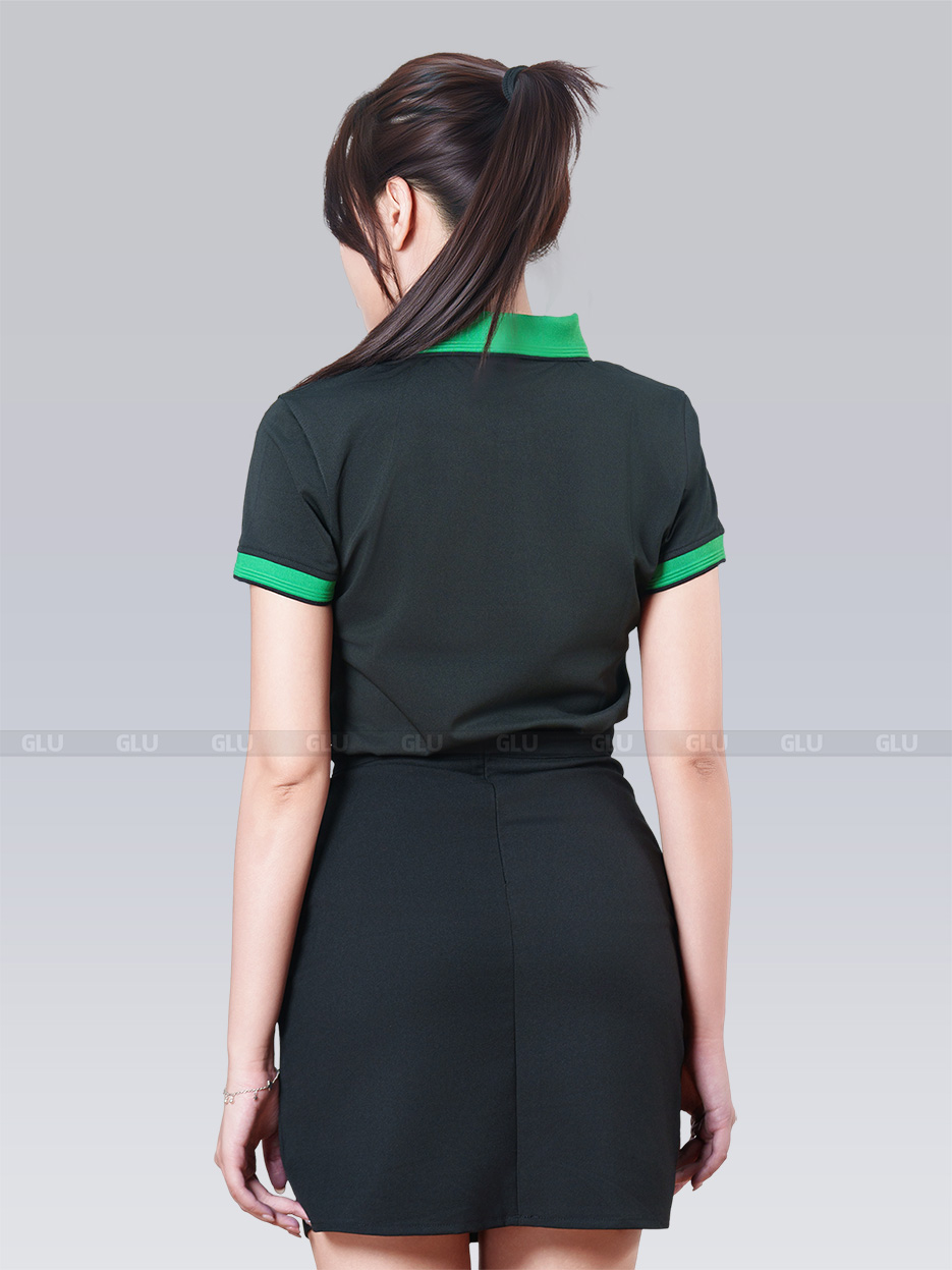 Mẫu đồng phục nữ này mang đến vẻ đẹp trẻ trung và năng động, hoàn hảo cho các doanh nghiệp tại Chí Linh. Với thiết kế áo polo màu đen cơ bản, điểm nhấn là sự kết hợp màu xanh lá nổi bật ở cổ áo và tay áo, tạo nên sự cân bằng giữa sự mạnh mẽ và tinh tế. Logo in sắc nét ở ngực trái là một chi tiết tạo dấu ấn đặc biệt, thể hiện rõ nét phong cách thương hiệu.